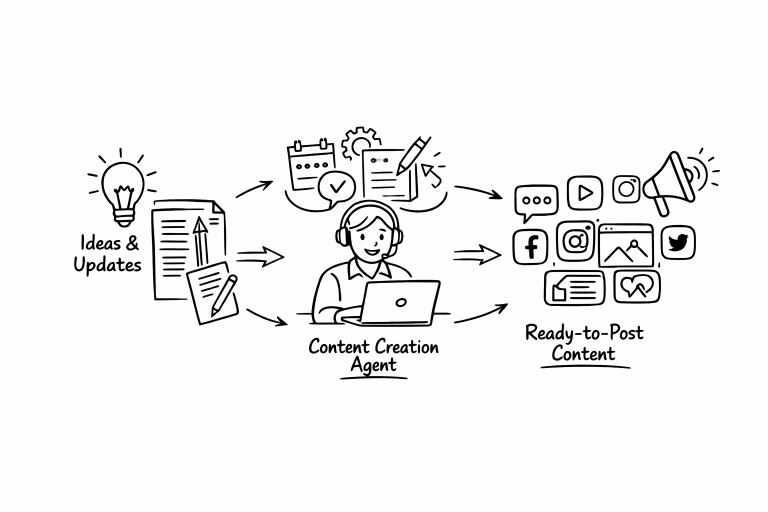 Our Content Creation agent turns your ideas, documents, and business updates into ready-to-post content across every channel. It plans topics, writes and refines captions, repurposes long-form into short-form, and generates platform-specific variations, while keeping your brand voice consistent and your workflow simple.